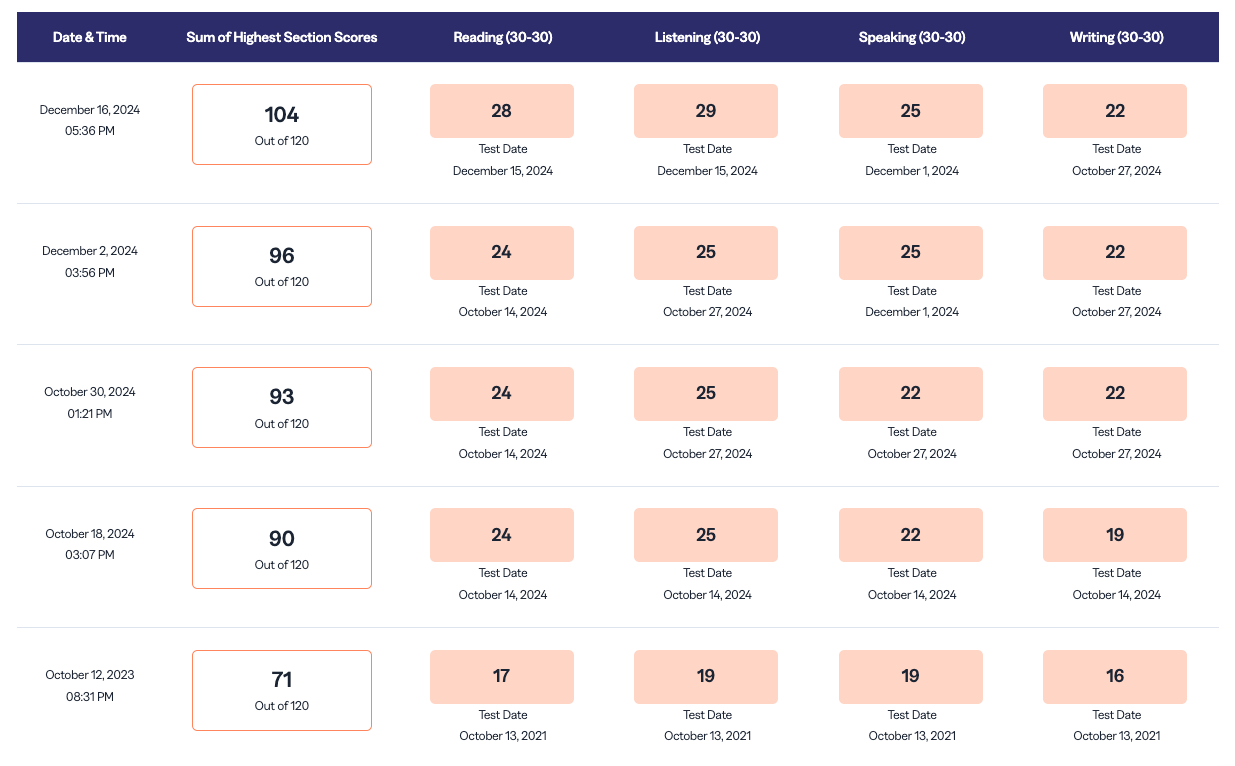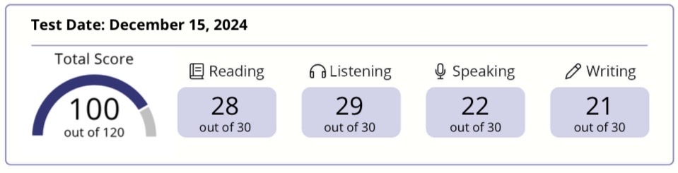 帰国後は、特に リーディングとリスニング に力を入れました。これらは明確に正解・不正解が出るため、仕事をしながらでも目標設定がしやすく、継続しやすかったからです。 ちなみにTOEFL受験前にTOEICを受けましたが、スコアは920点でした。